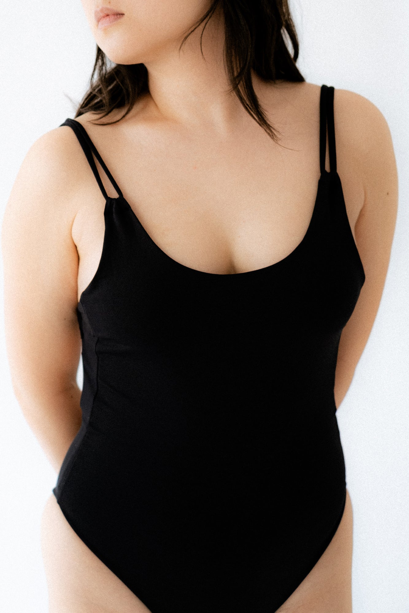 Der cleane Ausschnitt im Vorderteil wird durch zwei Träger ergänzt, die im Rücken elegant zu einem zusammenlaufen. Ein schönes Detail, das den tiefen Rückenausschnitt unterstreicht. Der hohe Beinausschnitt sorgt für ein angenehmes Tragegefühl und betont deine schöne Silhouette.