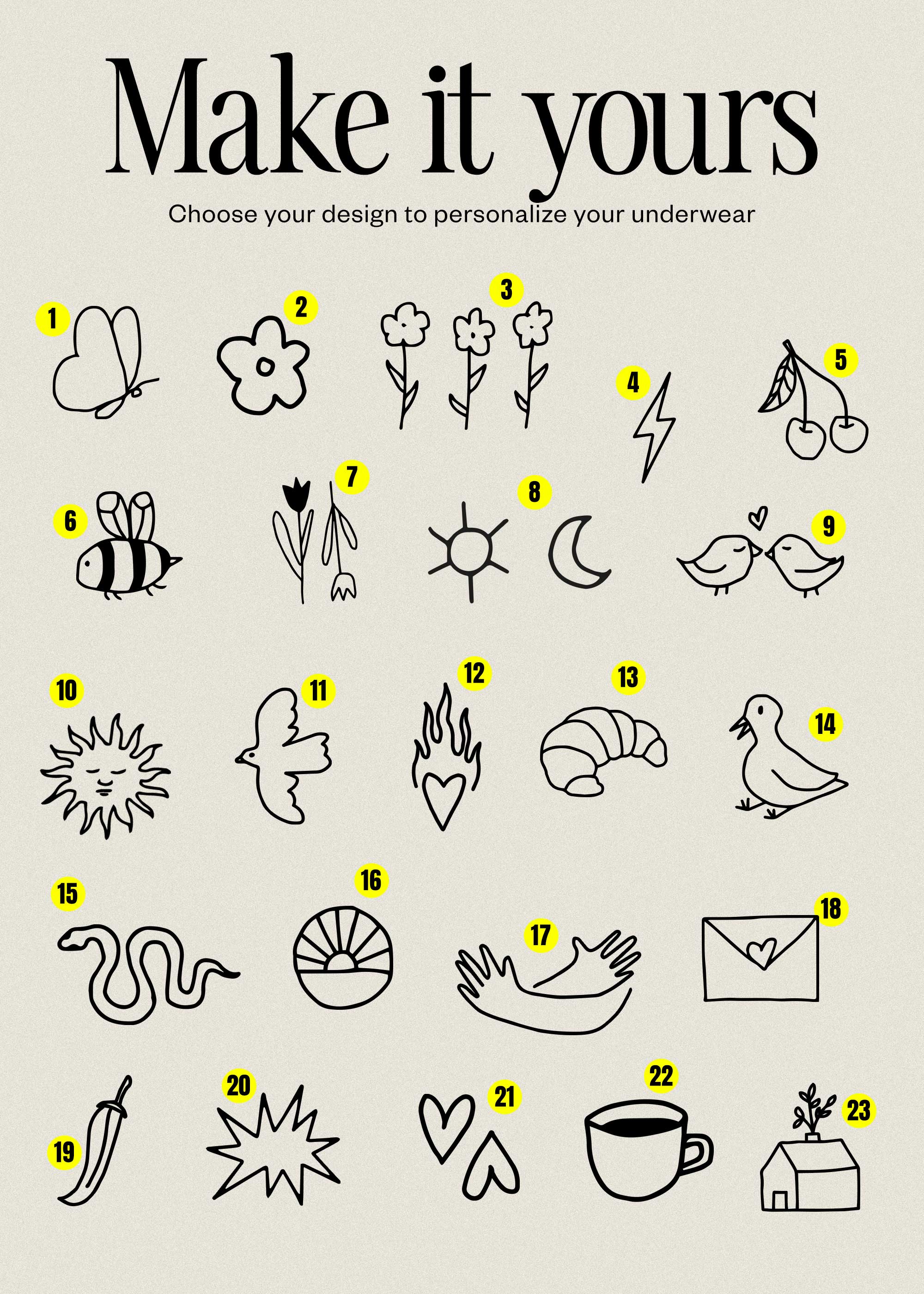Weil du einzigartig bist und Unterwäsche verdienst, die sich an dich und deine Bedürfnisse anpasst, kannst du sie ab jetzt personalisieren. Wähle aus einem Set von 23 Motiven. Das macht deine Wäsche zum Unikat und zum perfekten Geschenk für dich oder deine Liebsten.